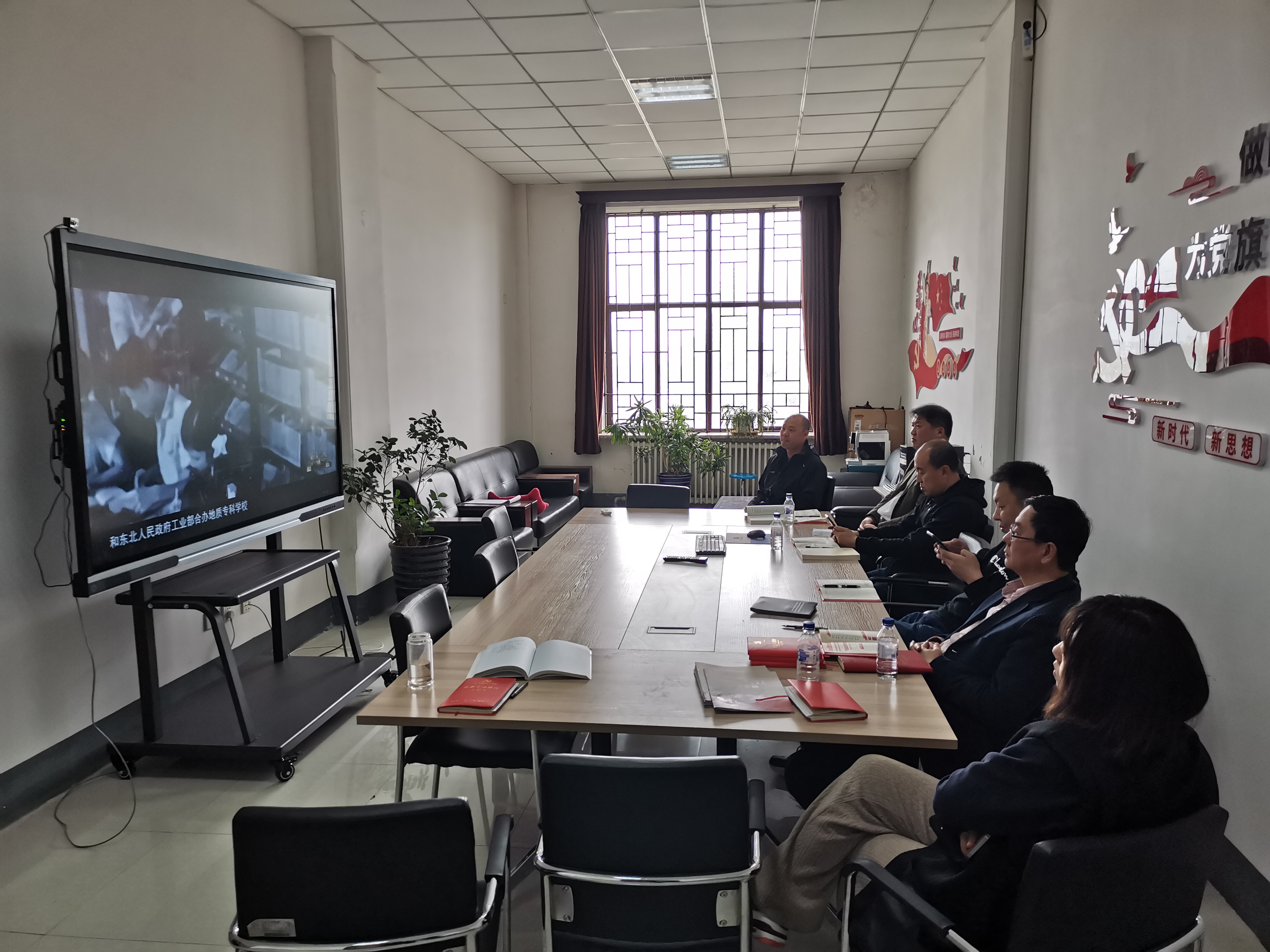 仪电学院教工行政党支部在地质宫420开展主题党日学习活动,会议由学院教工行政党支部书记边江主持,学院党委书记邱增凯与支部成员参加会议。