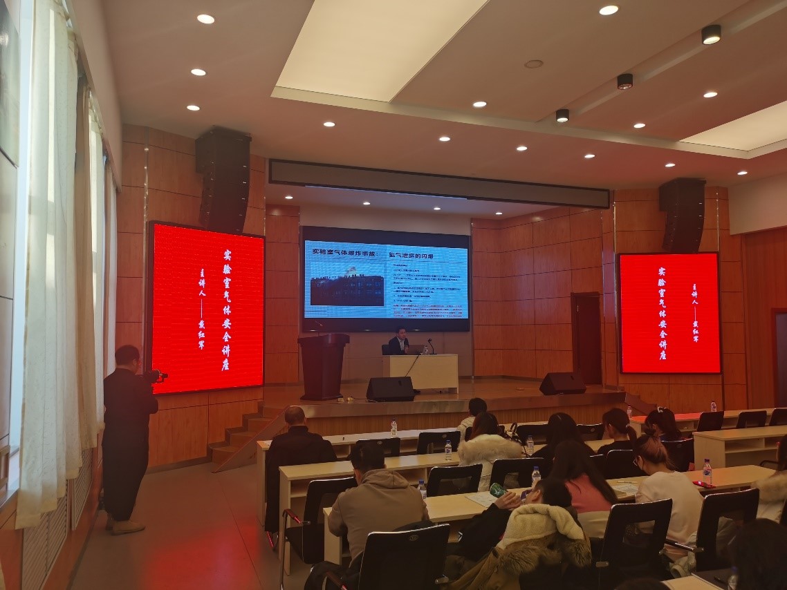 讲座的第一部分为化学类实验室安全讲座,由我校化学学院副院长张贺主讲,张贺结合多起由危险化学品引发事故的典型案例,深入分析了实验室用电、用火、危险化学试剂管理等方面可能存在的潜在危险,为参会师生树立了预防为主、未雨绸缪的指导思想。讲座第二部分由广州德标智能化工程有限公司的戴红军主讲,戴红军以《实验室气体安全讲座》为题,重点介绍了有毒气体、易燃易爆气体、惰性气体等可能造成的危害,并对高校实验室气体钢瓶的常见隐患进行了分析。讲座第三部分由长春奥狮环境监测有限公司的刘宇臣主讲,讲座内容包括电离辐射的类型、电离辐射的危害、电离辐射的防护等方面知识。