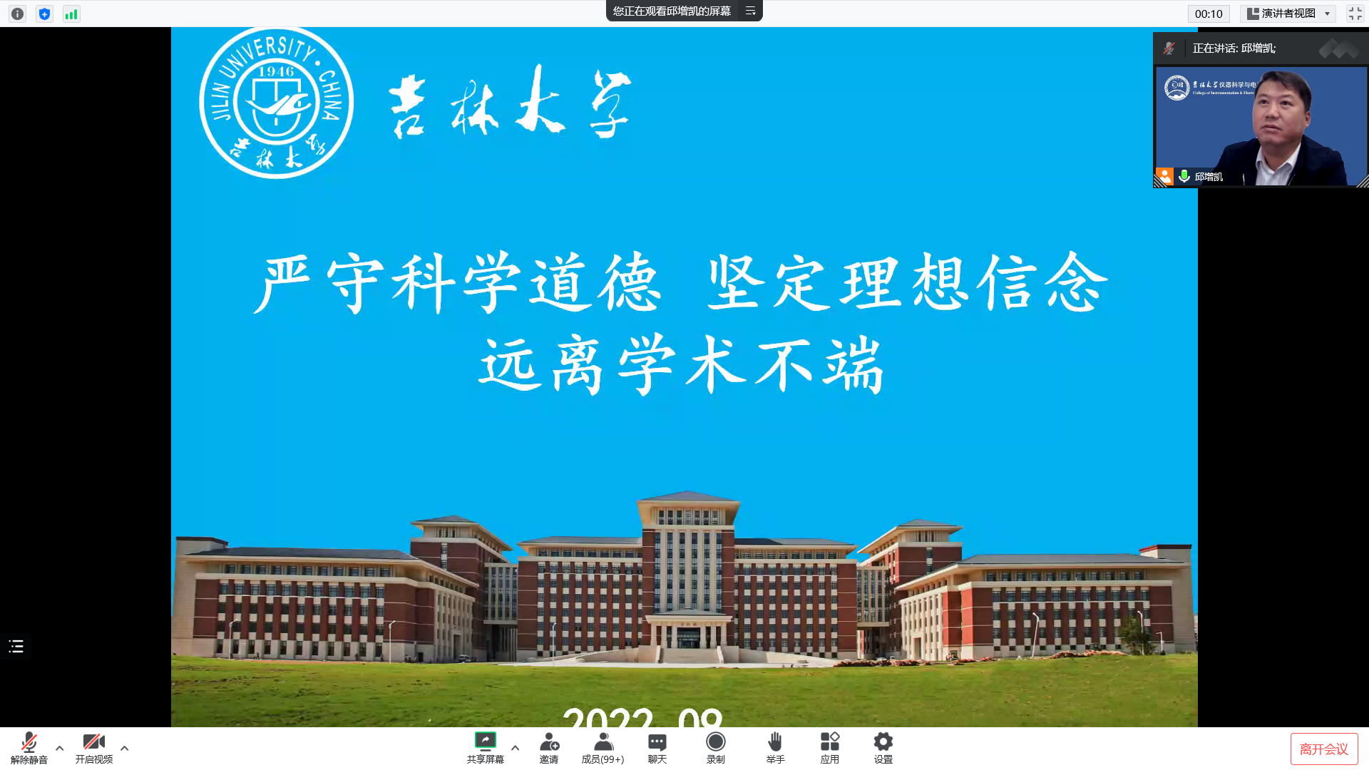 于2022年9月22日晚上18:00在线上腾讯会议组织开展以“严守科学道德,坚定理想信念,远离学术不端”为主题的学风建设讲座活动,活动由研究生辅导员周琪老师主持,党委书记邱增凯教授主讲,2022级博士、硕士研究生新生全体参加。