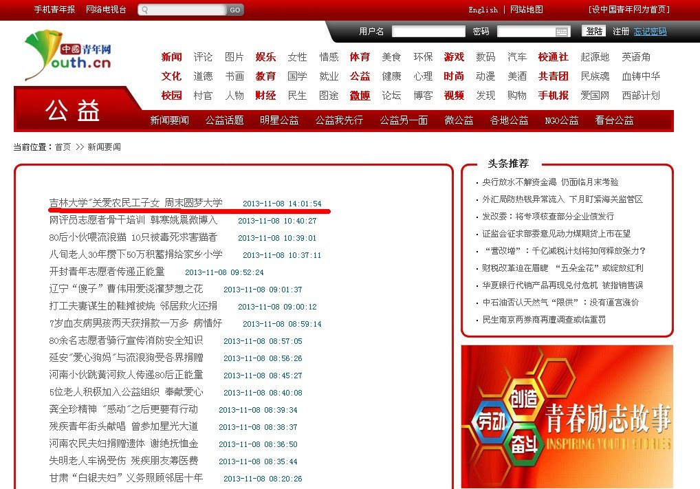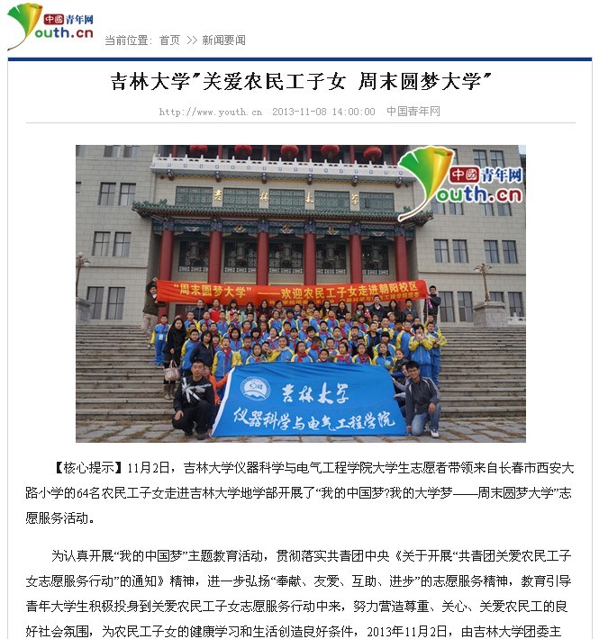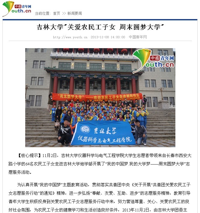 “关爱农民工子女 周末圆梦大学”》为题对此次活动进行了详细报道。中国青年网由共青团中央主办,是国内最大的青年主流网站。此次活动是继2013年8月6日中国青年网以《女同av