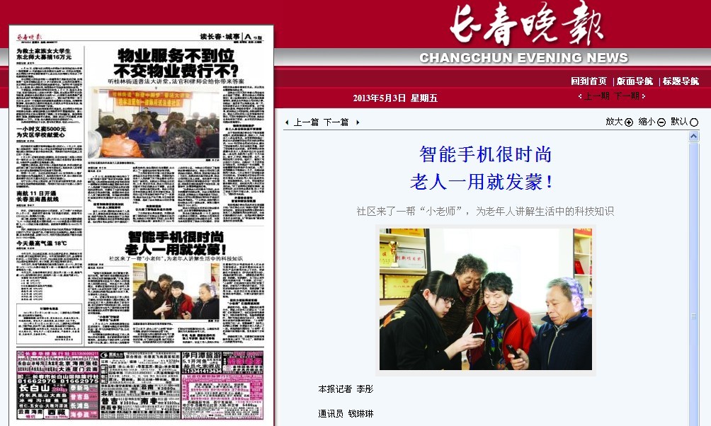 2. 长春晚报《智能手机很时尚,老人一用就发蒙——社区来了一帮“小老师”,为老年人讲解生活中的科技知识》//ccwb.1news.cc/html/2013-05/03/content_309971.htm