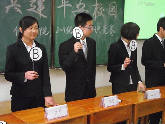 活动开始,主持人一一介绍参赛选手入场,首先是必答题环节,共10题,各位选手准备充分,都取得了不错的成绩。接着是抢答环节,选手们针锋相对,互不示弱。互动环节更是精彩纷呈,同学们纷纷上台献花更是将比赛带入了高潮。在一曲关爱生命的歌曲后,比赛进入到了最后的决胜局——风险题抢答,参赛选手沉着冷静,现场气氛激烈紧张,几轮抢答过后,终于产生了比赛的获胜者。最后,学院第六届分团委副书记包志强同学和学生会主席许鹏同学分别上台为参赛选手颁奖并合影留念。