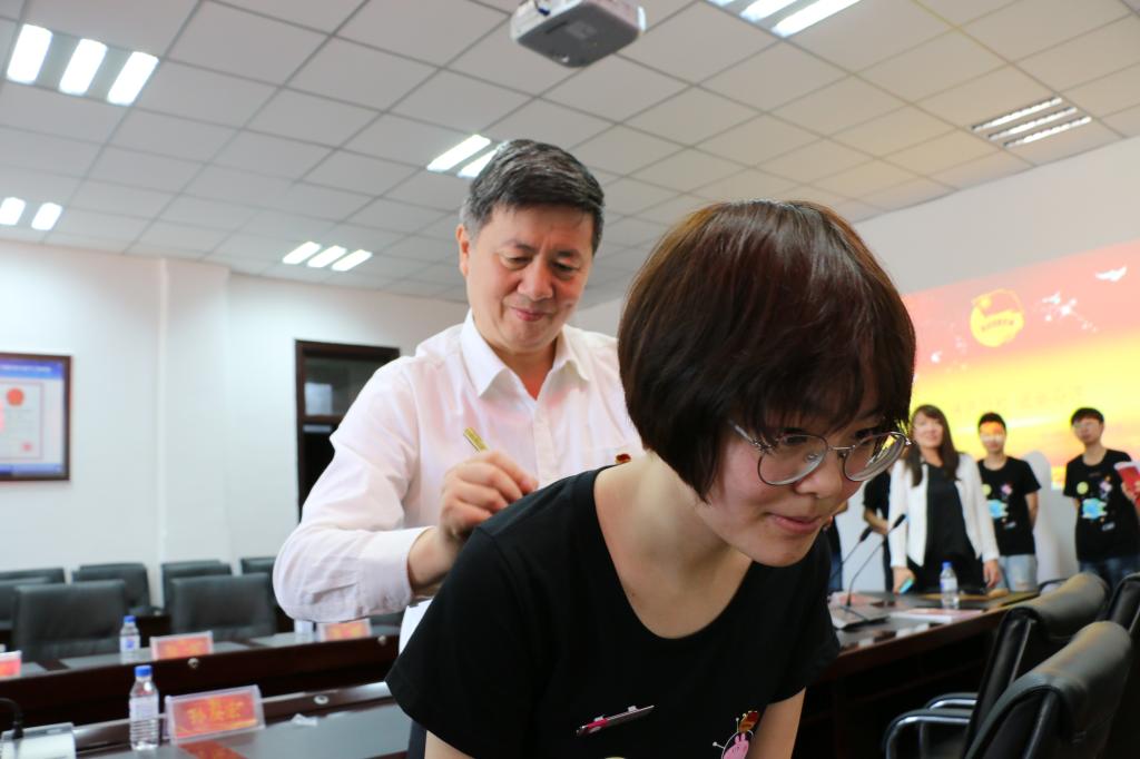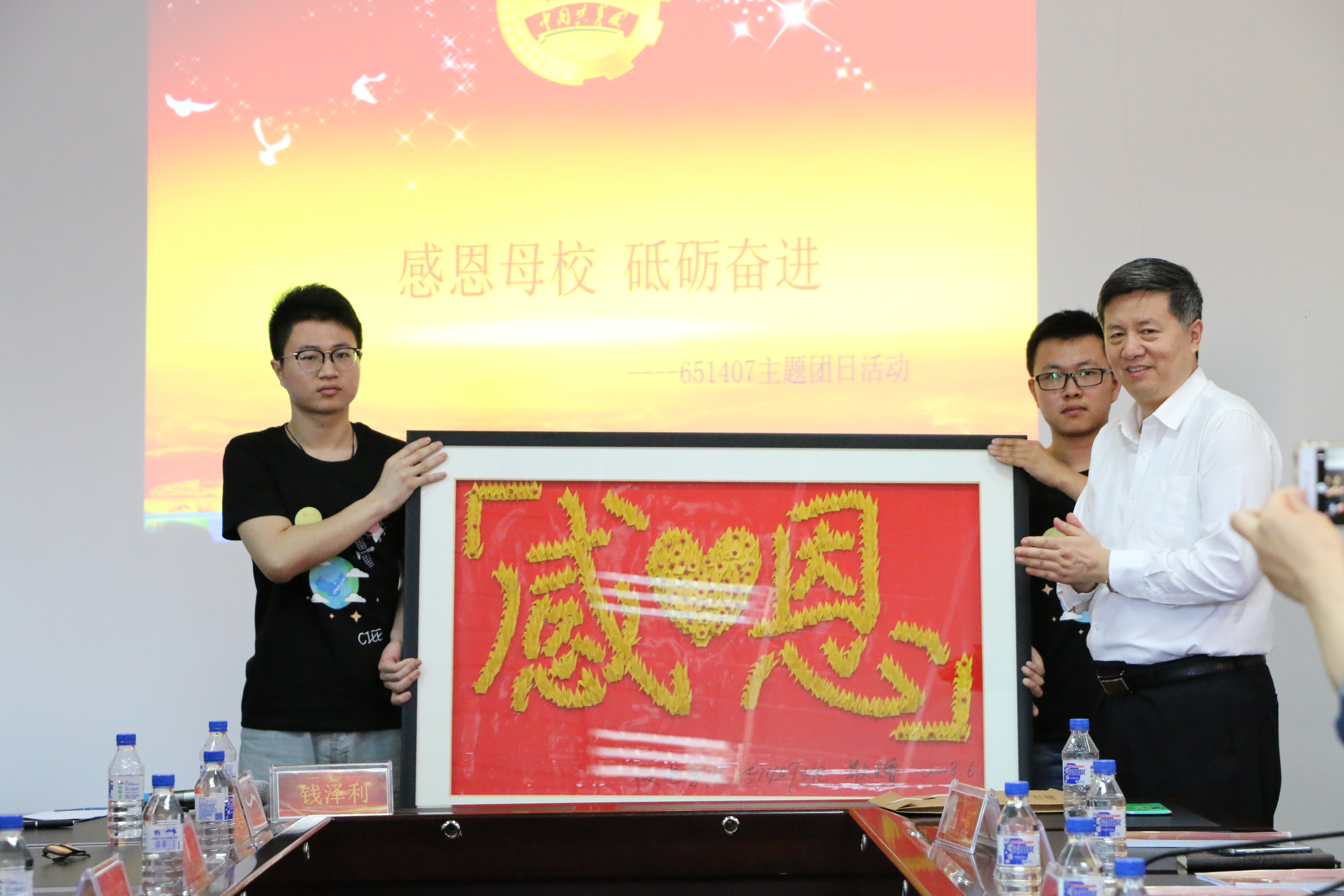 651407班团支部全体同学参与制作了520只纸鹤并拼成“感恩”字画,作为礼物送给学校,代表着同学们感激母校的浓浓赤子之情。孙友宏老师为同学们佩戴毕业纪念章,并在同学们的班服上签下了“感恩、创新、成才”三个词作为对同学们的祝福和希冀。老师和同学们一同合影留念,团日活动在温馨的氛围中走向尾声。