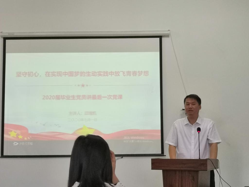 首先,党委副书记邱增凯以“坚守初心,在实现中国梦的生动实践中放飞青春梦想”为题给毕业生党员带来了一堂生动的党课。邱增凯书记从“初心是什么”出发,用一个个鲜明的事例阐释共产党人的初心,从战争年代到和平建设时期再到新时代,我党能够保持兴而不亡、盛而不衰、治而不乱,是因为共产党人始终坚守“不能忘记为谁而出发”的思想警醒、“一心一意跟党走”的坚定信仰、“坚持以人民为中心”的责任担当、“坚持把纪律和规矩挺在前面”的自我约束。邱增凯书记指出为打赢疫情防控阻击战,党中央统一领导统一指挥,广大党员牢记初心使命,充分展示了共产党员的责任与担当,在讲到学院身边党员的感人故事时,邱增凯书记一度哽咽,毕业生党员也纷纷动容,响起热烈而持久的掌声。邱增凯书记对即将走入社会岗位的毕业生党员提出殷切希望,要进一步坚定理想信念,进一步提高能力素质,进一步弘扬求真务实的精神,进一步提振精神状态,进一步增强责任担当。最后,邱增凯书记、周伟书记同全体毕业生党员一起面向党旗庄严宣誓,入党誓词字字铿锵有力,句句激昂慷慨,表达着全体毕业生党员为共产主义事业奋斗终身的决心。