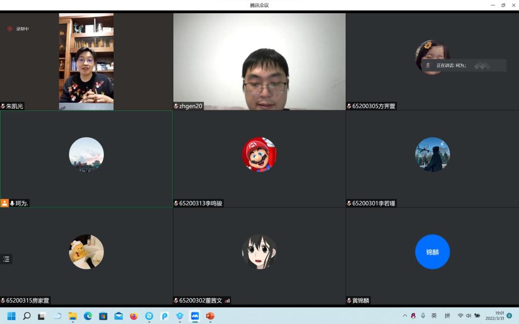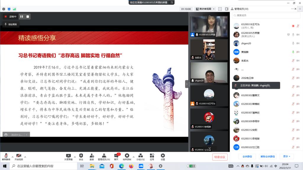 分享会上,团支部书记方荠萱向与会老师同学们介绍了《习近平与大学生朋友们》的主要内容,并分享了自己的诵读视频,她提到,习近平总书记与大学生朋友们交谈时,十分幽默、平和,能从一字一句间感受到习近平总书记对青年一代的亲切关怀。随后,团员代表王可为同学节选 “志存高远 脚踏实地 行循自然”这一章节的内容分享了自己的精读感悟,他谈到,疫情之下的这段特殊时期,对于大家都是一种磨砺。大家要团结在一起,众志成城,以不可动摇的决心打赢这场疫情防控阻击战。黄锦麟同学也跟大家分享了自己的阅读心得,他从习总书记与正定县籍大学生的交流中得到启发,习主席通过乡村调研,发现乡村发展的关键所在,对不同的发展问题对症下药。在未来从事的行业中,我们也应当具体问题具体分析,深入调研。会议最后,朱凯光老师和周海根老师也和同学们分享了自己的体会,我国的科研在一些领域还存在着短板,敦促同学们在封闭管理期间合理利用时间,志存高远,脚踏实地。同学们纷纷表示,自己将不断提高线上学习效率,合理安排自己的学习生活,树立远大理想并为此努力奋斗。