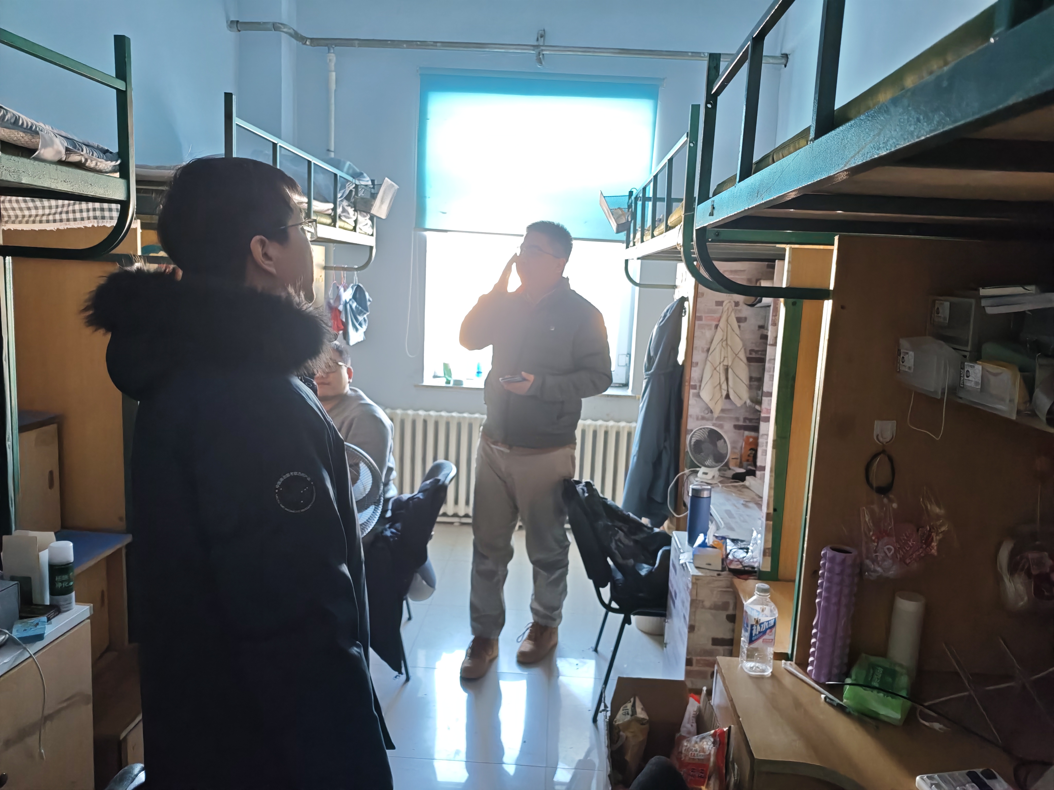 在朝阳校区学生公寓,两位老师逐间走访研究生寝室,细致排查安全隐患,实地核查研究生假期留校及合寝情况,详细询问了申请在校过春节研究生的科研进展和日常生活情况。在已离校研究生寝室,重点核实断电情况和物品整理情况;在未离校研究生寝室,两位老师叮嘱大家施工期间要做好物品整理和防尘工作,在校期间要注意人身安全、财产安全、出行安全、实验室安全、公寓安全,防范电信和网络诈骗。