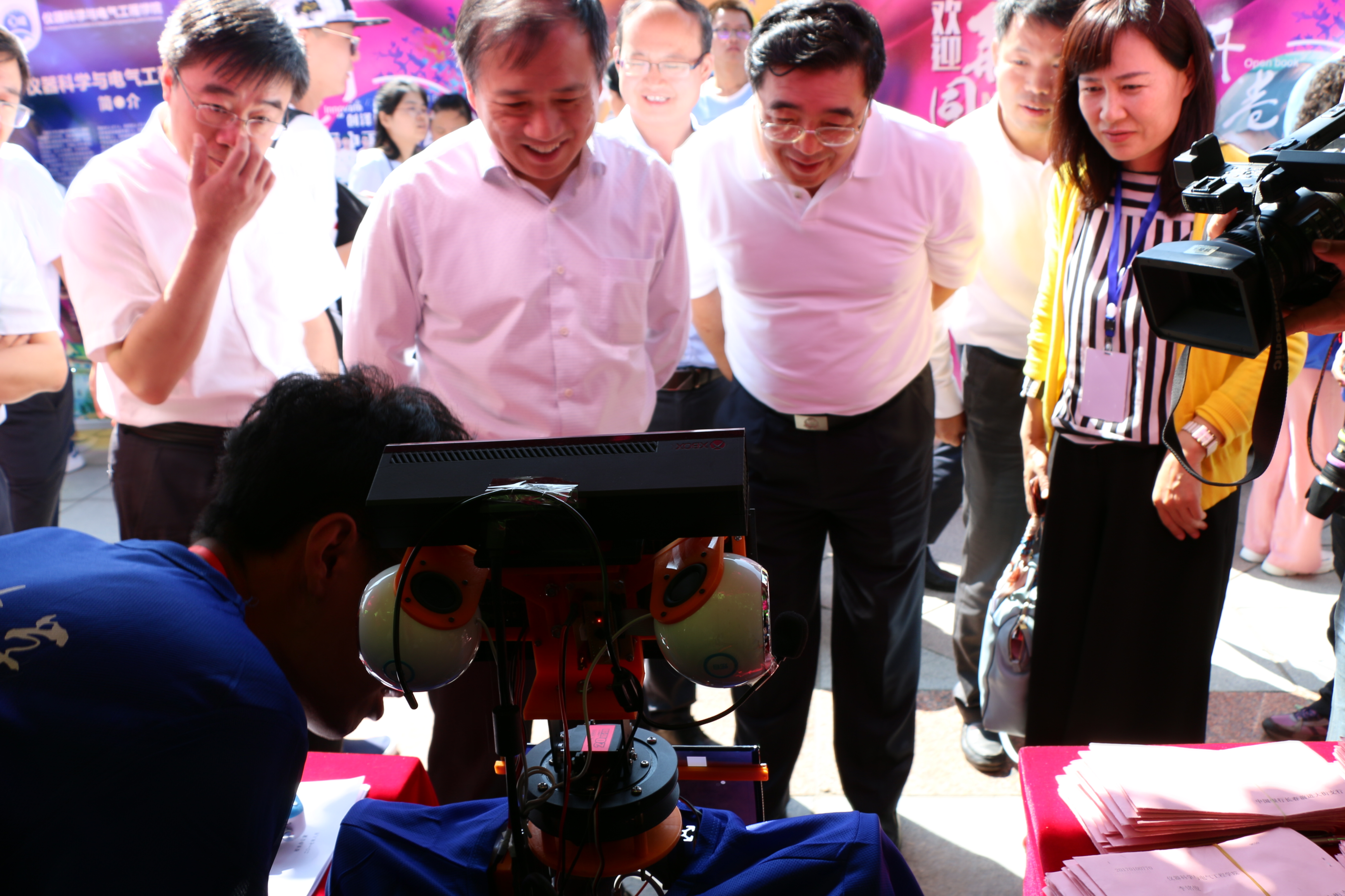 “小七”机器人是仪电学院本科生自主研发设计的,从正面看他是一个穿着蓝色迎新服装的小机器人,具有表情显示器、麦克风、音响、显示屏、驱动轮等硬件设备,可以由蓝牙键盘和手机发出指令远程对其控制。此次迎新工作中,他的出现大大减轻了现场工作的同学们的负担,同时实现了新生报到过程由纸质到电子的转化。负责维护“小七”的同学也为慕名而来参观的领导、老师、记者们解释了小七的迎新工作原理并当场演示他的工作效果。目前,仪电学院的迎新机器人小七已经被《长春晚报》、《腾讯新闻》、《吉林新闻》等多家媒体报道,受到了大家一致的好评。据了解,机器人“小七”是互联网+大赛的参赛设计成果,它旨在缓解孤寡老人独自在家没人照顾而孤独无助的情况,可以与老人进行语音互动,而且具有人体健康状况检测功能,在联网情况下,当检测到老人身体异常时可自动联系医院进行通知,其应用前景十分广泛。