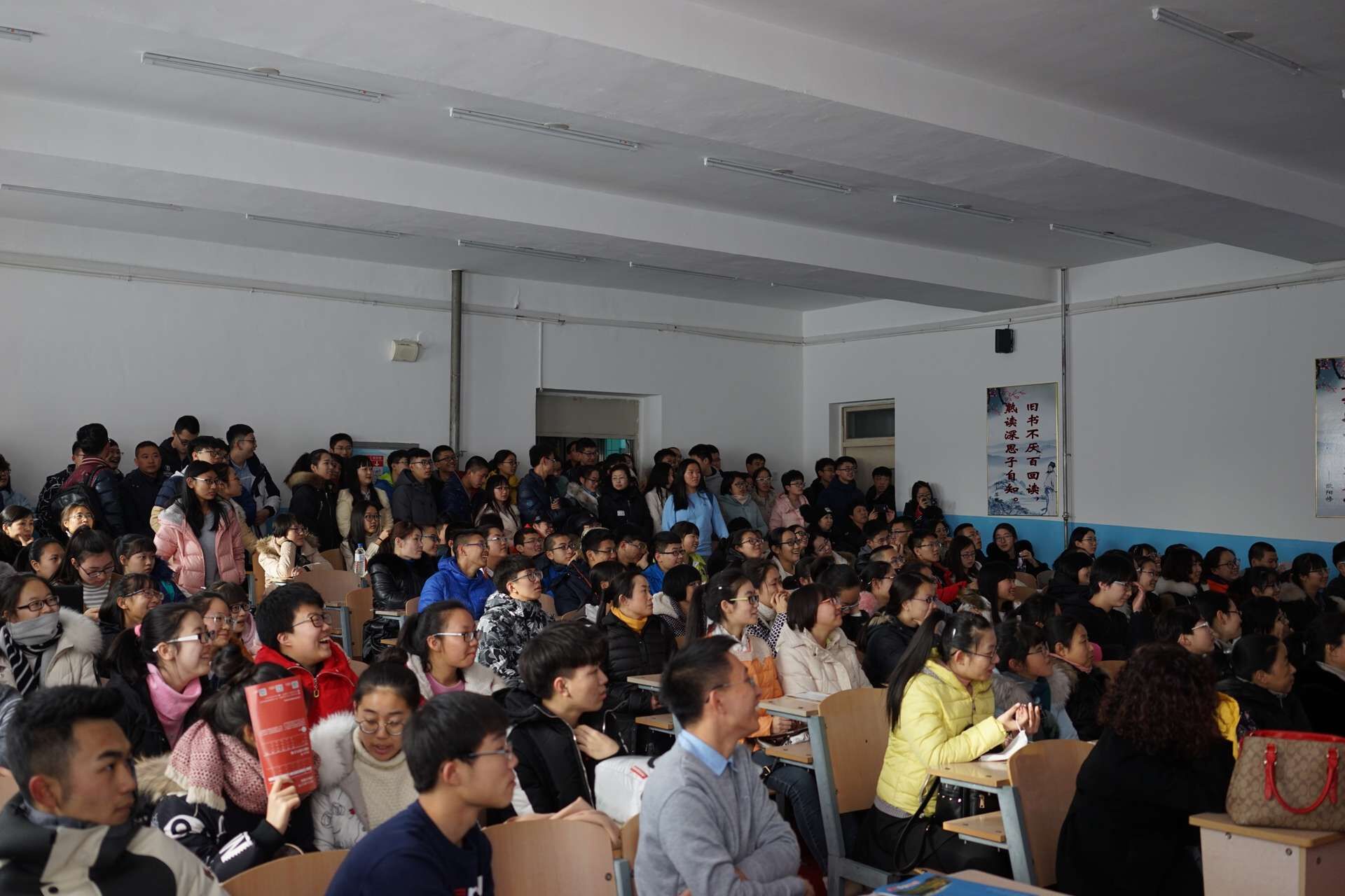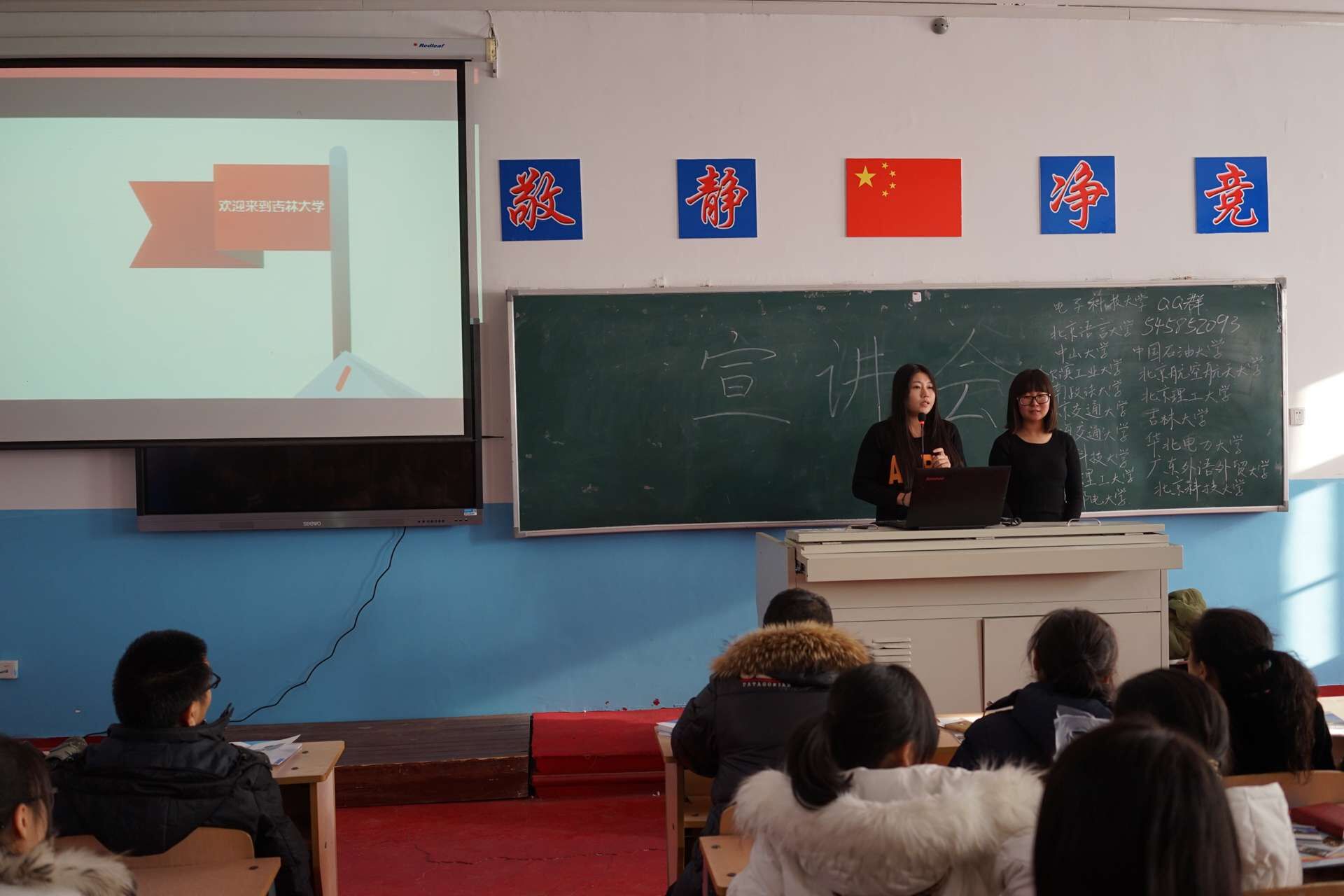 在2月13号中午12点,周帅宇同学及其团队成员来到四平市第一高级中学南楼一楼阶梯教室,在此之前他们已经联系好学校广播站为其宣传,同时在学校的显著位置张贴了海报。由于成功的前期宣传,致使去听讲宣讲会的学生与家长非常多。活动由主持人协调现场,主持人也是实践团队一员,在别的高校校友介绍完他们的学校后,女同av