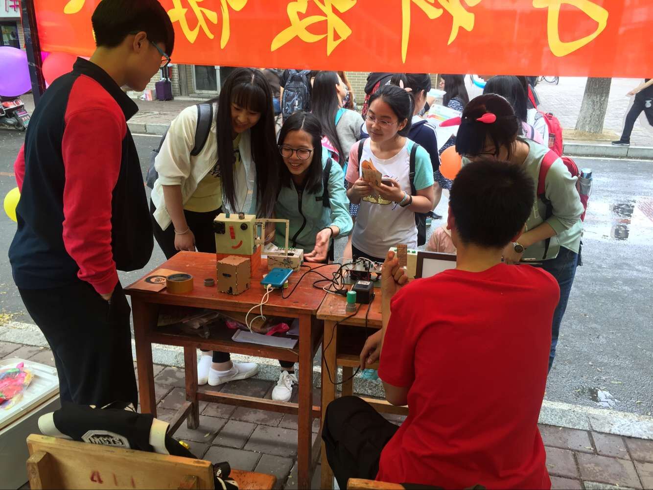 同学在电子设计大赛中的优秀科技作品吸引了过来。看着正在调试中的3D打印机、光控时控调光玻璃、等离子音响、自平衡小车等出色的作品,大家十分好奇,更多的还是惊叹。这些制作精美、创意十足的电子设计作品,让同学们和市民朋友感受着世界的新奇和科技的魅力。上午11点,嘉年华活动正式开始。电子科技协会的帐篷前马上便围满了慕名前来的吉大师生和市民朋友,大家都好奇地向科协的同学们提出自己的问题。科协成员一一为大家展示每个作品的功能,耐心地回答大家提出的问题。本次活动还准备了互动环节,各位游客既可以选择列举自己所了解的电子设计领域中常见的10种基本元器件名称,也可以来用DIY电子琴演奏一首自己熟悉的曲目等等。在科协的同学们的提示和帮助下,同学们都在收获新知识的快乐中完成了任务,并都满意地给电子科技协会点了大大的赞。