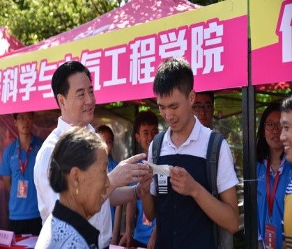 迎新工作点,正逢一新生和家人来到迎新地点报道,李元元校长与年迈奶奶进行亲切交谈,李元元校长向奶奶介绍了女同av