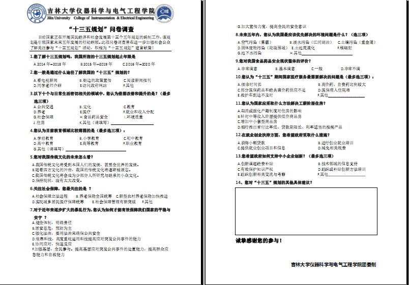 团委组织成立了“东北振兴发展”大学生社会实践调查团并查阅相关资料,召开前期组织动员活动,并且于1月下旬,完成了最终调研问卷。问卷涉及文化教育、公共交通、医疗卫生、环境质量,住房、养老与社会保障、就业与收入分配等百姓热切关注的焦点问题。此次建言献策调研活动通过实地问卷调研的形式,得到基层群众关于十三五规划的期望与意见,并以此作为第一手资料,形成有内容、有层次、有逻辑的调研报告。按照调研进度安排,女同av