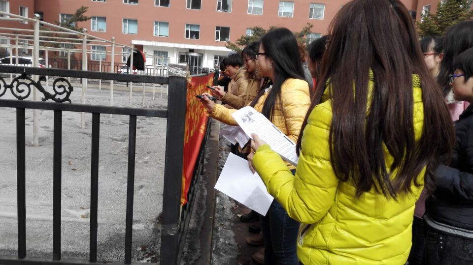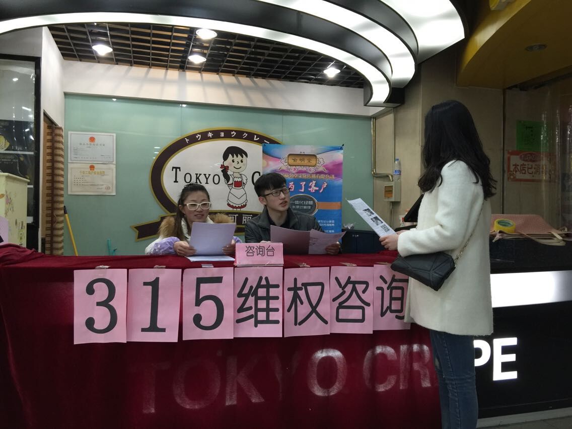 朝阳校区男女寝门口展开消费者维权活动。志愿者设立了咨询台,帮助市民进行相关申诉和举报,解答市民的维权疑问,与市民进行维权法律常识的交流。在整个交谈过程中,志愿者发现,消费者的法律维权意识需要普及深化,消费观念需要绿色环保。最后,志愿者在各个活动现场举行了签名仪式,所有志愿者邀请前来参与活动的市民在横幅上签名并写下大家在消费维权方面的美好愿望或建议,增强大家对消费现状以及消费者维权保护方面的信心。