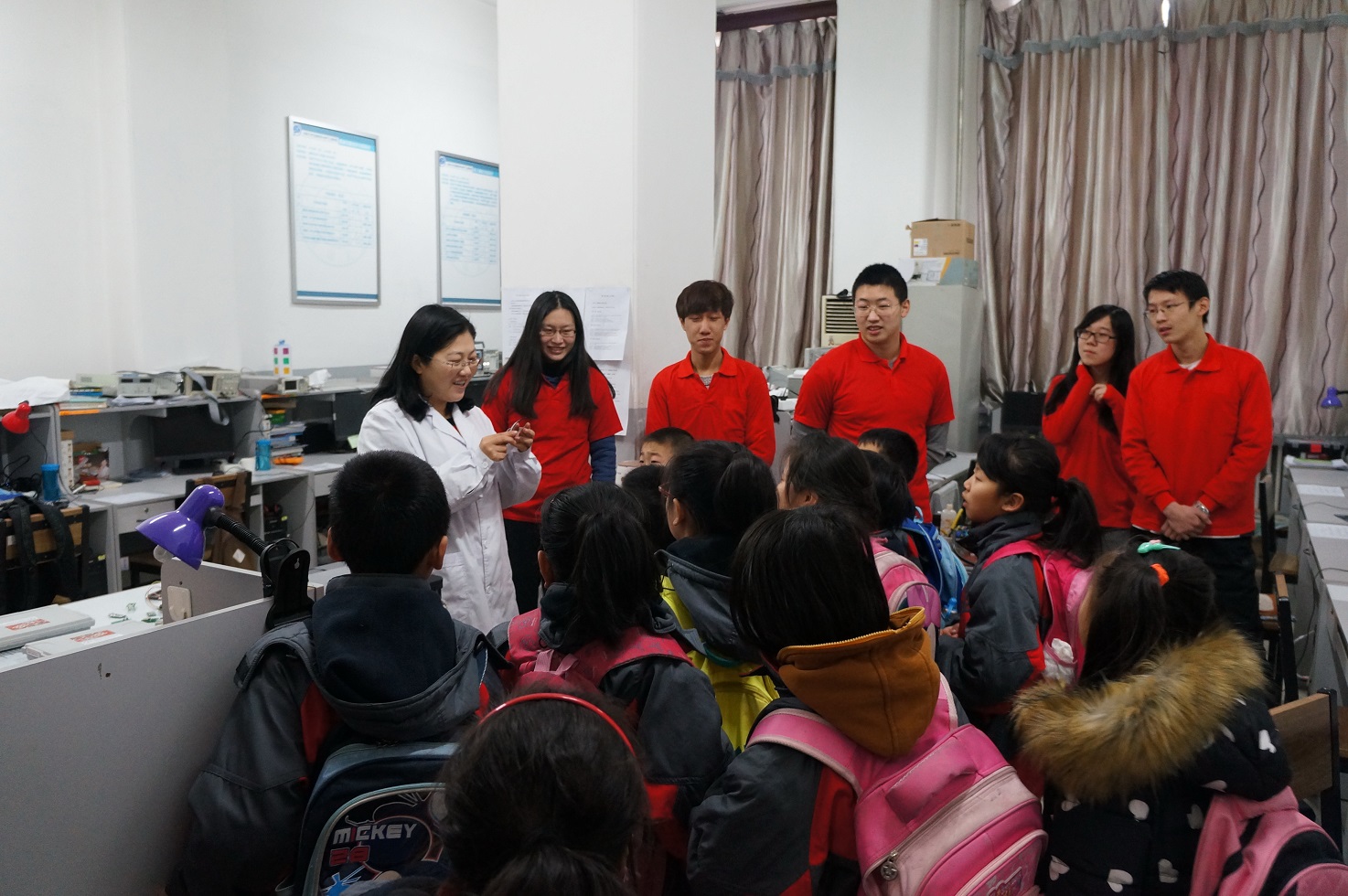 大学生科技创新开放实验室,实验中心千承辉老师和万云霞老师在这里热情地接待了他们,带领他们参观了各式各样的实验仪器,并亲自为大家进行演示,小朋友们认真聆听、跃跃欲试,从孩子们清澈明亮的眼睛里我们看到了他们对科学知识的渴求和对大学生活的向往。
