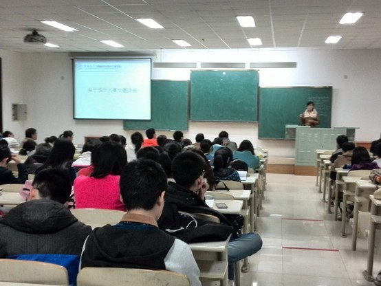 学生近年的获奖情况;随后,她跟同学们分享了自己多次参加电子设计竞赛并取得优异成绩的经验,并鼓励大家要积极地将所学的专业知识与动手实践有机结合,她动员2013级全体同学积极参加到即将举行的校电子设计竞赛中,鼓励大家认真选题、大胆创新,力争在今年的校电子设计竞赛中再创佳绩。讲座结束后,裴利然同学还耐心地与2013级同学进行了交流与沟通,针对同学们提出的问题给出了宝贵的意见。