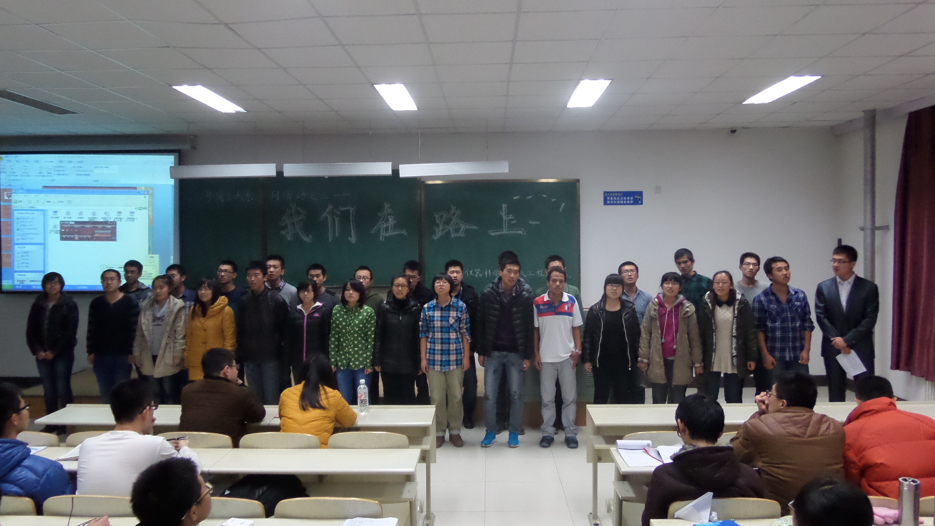 团委组织开展以“认识吉大之真 感受吉大之善 欣赏吉大之美”为主题的青春励志系列活动。2013年12月3日,2013级测控专业三班在中心校区李四光楼306教室举行了“奋斗的青春,我们在路上”的主题班会活动,2013级三班班导师辛毅副教授、院团委副书记兼2012级辅导员蔡印老师及2013级全体同学参加此次活动。