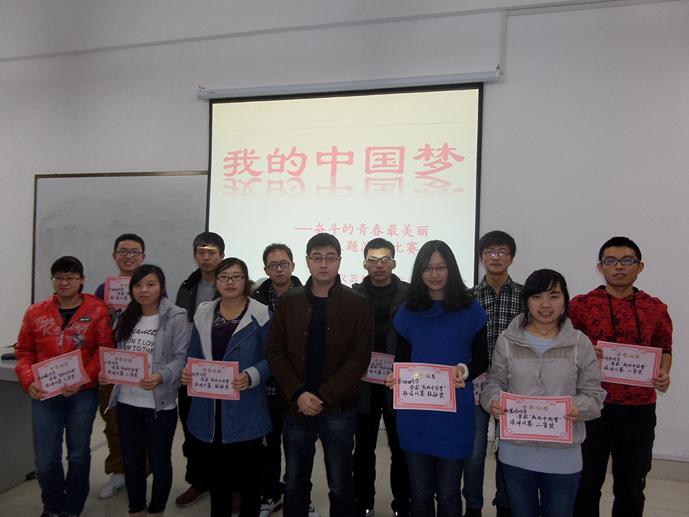 团委精心组织各班级团支部开展主题团日活动。2013年11月21日,2012级、2013级各班团支部在中心校区李四光实验楼147室举行了“我的中国梦——奋斗的青春最美丽”励志主题演讲比赛。院团委副书记、2012级辅导员蔡印老师以及2012、2013级全体同学共同参加了此次活动。