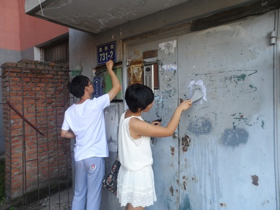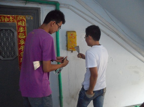 社会实践团成员首先来到长春市朝阳区清和街道南昌社区街道委员会,街道工作人员热情地接待并向实践团的志愿者们讲解了本次清洁社区的主要工作任务即清理社区楼道的小广告。据街道工作人员介绍,楼道小广告一直困扰着小区居民,影响社区环境卫生。为了改变社区整体环境、提升整体形象,社区工作人员希望与大学生志愿者一同行动,为美化小区环境出力。上午9:00,清理工作正式开始,志愿者们深入到社区楼院里,积极开展清除小广告的活动,虽然天气炎热但志愿者们依然积极热情,大家纷纷拿起小铲子、喷壶等工具对社区内的小广告进行了集中清整。期间,有社区居民经过看见志愿者们辛苦的工作,纷纷向志愿者们表示感谢。经过三个多小时的辛苦工作,志愿者们将南昌社区的楼道小广告全部清理干净,有效地维护了社区的整体形象,保障了社区环境的干净整洁。