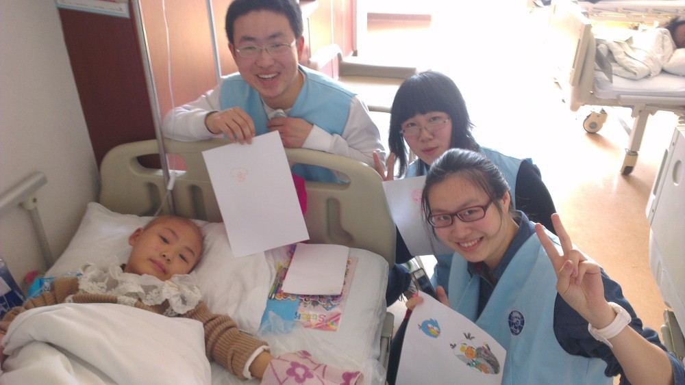 小星悦已在病床上接受了多期化疗,原来的满头黑发脱落得一根不剩。小星悦的爸爸常年在外打工,只有妈妈一直陪在身边。看到志愿者们来到身边,小星悦脸上露出了灿烂的微笑。虽然身患重病,但她依然很坚强,天真的笑脸,清澈的眼神,无不留露出她对生活的希望。小星悦非常喜欢画画,看到志愿者们来到身边陪伴,迫不及待地与哥哥姐姐们分享护士们送给她的画作。志愿者们也不甘示弱,为小星悦画了她最喜欢的“愤怒的小鸟”、“白雪公主”。小星悦还特别擅长唱歌,志愿者同学们与小星悦进行了唱歌比赛。小星悦乐观懂事,从不让妈妈担心,虽然打针的疼痛有时会让她落泪,但面对病魔她从不畏惧。据悉,小星悦将于四月底出院,坚强的她期待每天灿烂的朝阳,她相信最美丽的是晨曦。