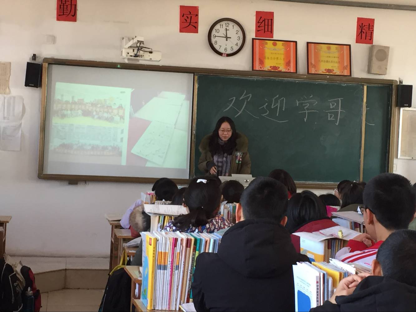 刚进入教室,学弟学妹们就用热烈的掌声欢迎了宣讲队的成员们,宣讲队的成员们依次进行了自我介绍,宣讲活动就在这样的热闹气氛中开始了。首先,张筝与穆双双两位同学借助PPT详细地向同学们介绍了女同av