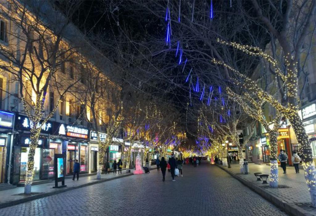 接着,调研团队来到了哈尔滨著名的步行街中央大街。走在方石路上,感受岁月对大街的洗礼;漫步步行街中,体验西方欧式风情。团队成员首先参观了各类欧式建筑,又感受了当地人的热情好客。尤其是在快要过年期间,商家纷纷挂出小彩灯,红灯笼,还有映射在方石路上的雪花,充满了浓浓的年味和哈尔滨冰雪的魅力。