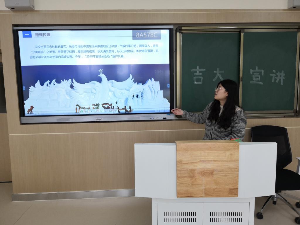 悠久的历史、得天独厚的地理位置以及学校概况,其中秀丽的四季风景使身在南方的学弟学妹们惊叹不已,大家对雪雕、冰雕、雪场、雾凇等心生向往。趁着同学们的兴致,宣讲人袁凡清绘声绘色地讲述了初见雪景的激动及相关娱乐活动的奇趣体验,学弟学妹们也逐渐活跃了起来。接下来的杰出校友、人才培养、国际合作等的讲述,彰显了我校深厚的底蕴、开阔的视野及广阔的平台,各方面均表现出我校作为一流大学的雄厚实力。相信之前尚不了解女同av