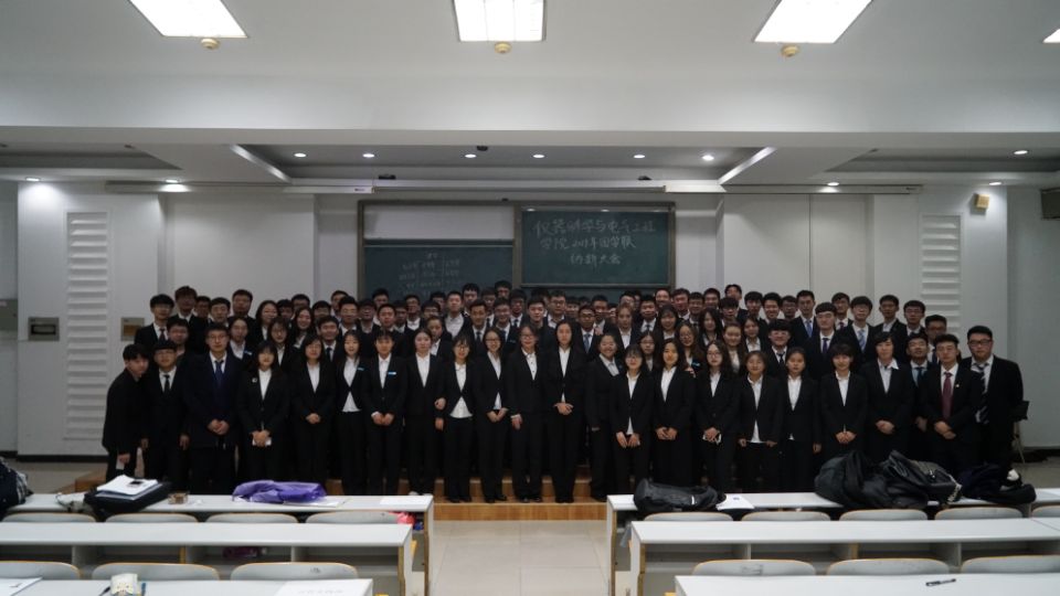 团学组织纳新暨表彰大会在前卫南区经信教学楼第八阶梯举行。学院博士生兼职辅导员周琪、博士生兼职辅导员于思佳、学生会主席陈亦楠、学生会副主席孙月、分团委副书记高金潇、分团委副书记兼新闻媒体社社长高兴、社团联合会主席周帅宇及其他各部门主要干部和2018级同学参加了本次大会。