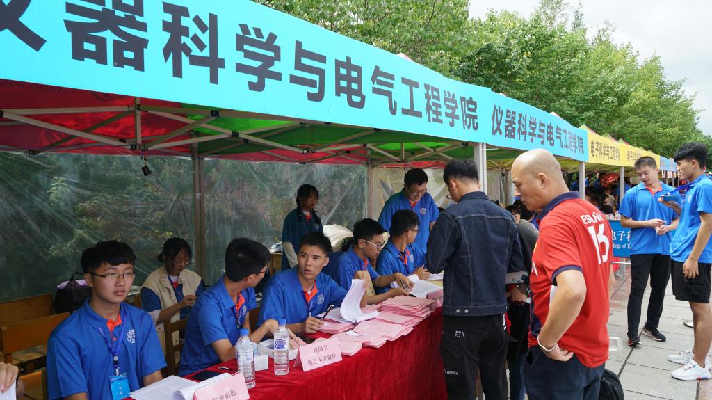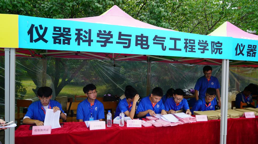 多位校、院领导也前来看望仪电学院迎新工作人员以及报到新生,并在现场指导工作,解答新生及家长的问题,确保迎新工作顺利进行。在迎新准备工作中,院党委副书记周伟老师冒雨组织工作,热情与新生及家长交流,解答在大学的学习、生活问题, 2019级新生辅导员马姗姗老师尽职尽责,维持迎新现场的秩序,为新生及新生家长答疑解惑。2019级新生也礼貌配合,使得迎新工作顺利进行。