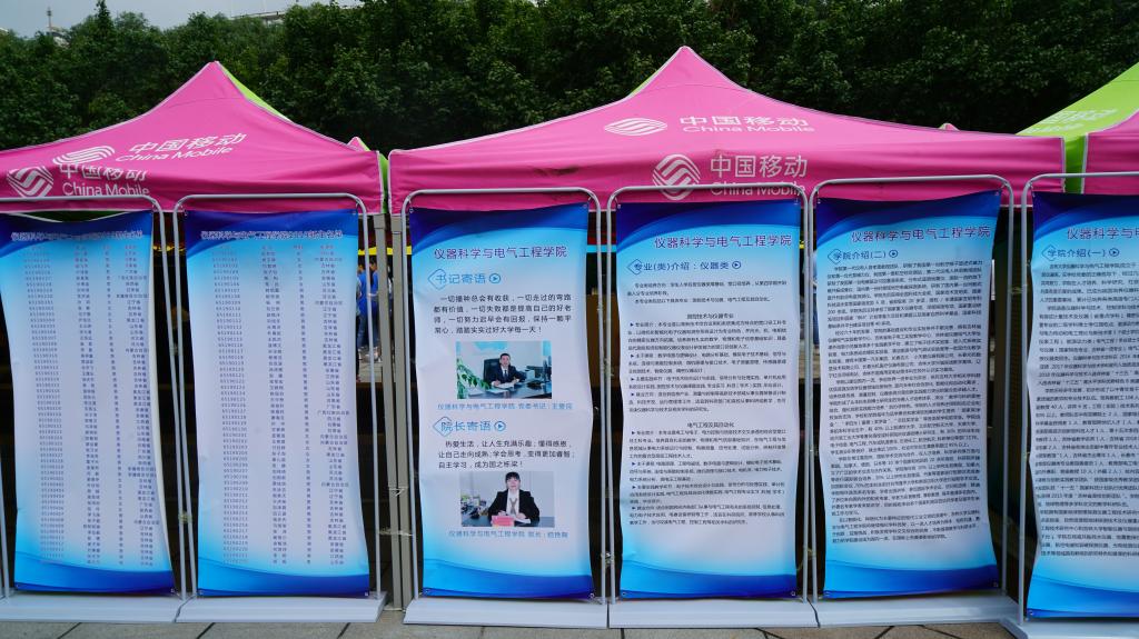 和专业介绍,四张内容为新生名单,另外一张写有书记和院长的寄语,表达了对新生的殷切期望。另外,接待新生的前台设有六个岗位,分别为新生报到处、材料袋领取处、寝室钥匙领取处、一卡通及银行卡领取处、生源地贷款咨询、绿色通道。新生报到按照前台设置的岗位顺序为流程,有条不紊地进行。