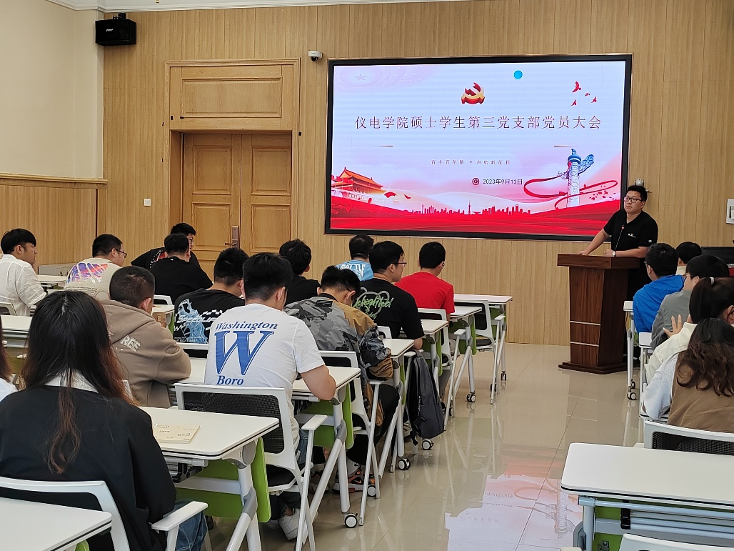 仪电学院硕士学生第三党支部于地质宫208多功能厅召开了党员大会,此次党员大会由党支部书记史博日同志主持,全体支部党员参加大会。